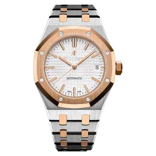 The Royal Elite features a high-precision automatic movement, housed in an octagonal case that merges brushed steel and rose gold accents. Its integrated bracelet design includes alternating metal links, complemented by a textured dial and a reliable date display at 3 o’clock. Designed for elegance and endurance—water-resistant and finished with a free size adjuster.