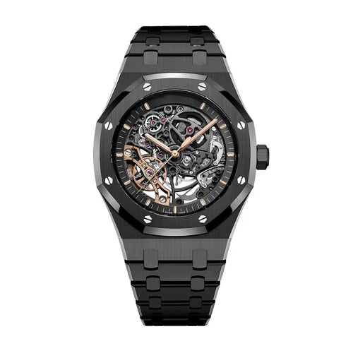 Obsidian Reveal – Automatic Skeleton Watch | Gunmetal Octagon with Rose-Gold Accents